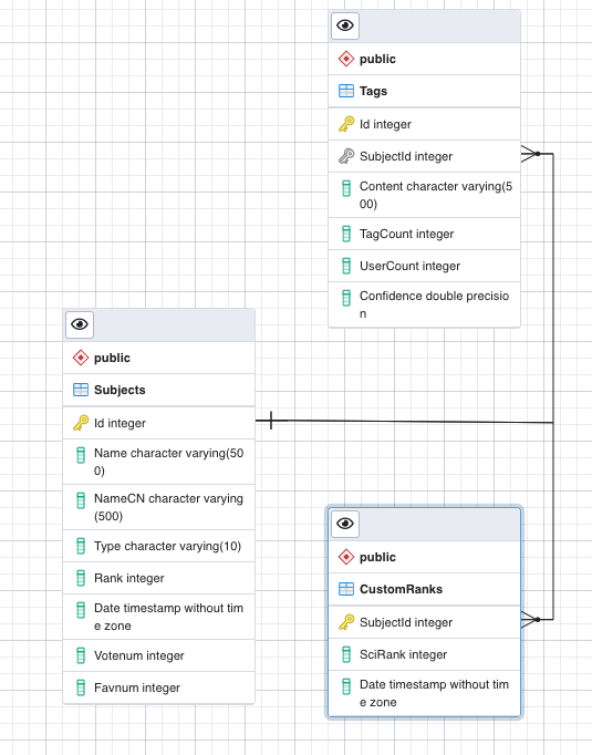 那么我们需要数据库支持这样的操作。理论上两张表:Subject 表和 Tag 表。Subject 表存储所有番组条目信息,以番组 id 为主键。Tag 表存储标签信息。咋一看标签与条目属于多对多的关系,但是在上面的 API 设计中每个标签在不同的番组中有不同的 Confidence,这就使得我们要把标签与条目设计成多对一的关系:在 Tag 表中,每个标签由其标签内容和关联条目唯一确定。另外,Subject 表应该存放科学排名。但是在 Bangumi Spider 中科学排名被生成为一个单独的文件,为了兼容这种历史遗留问题我们就把科学排名也作为一张表,以一对一的关系与 Subject 表以外键连接。